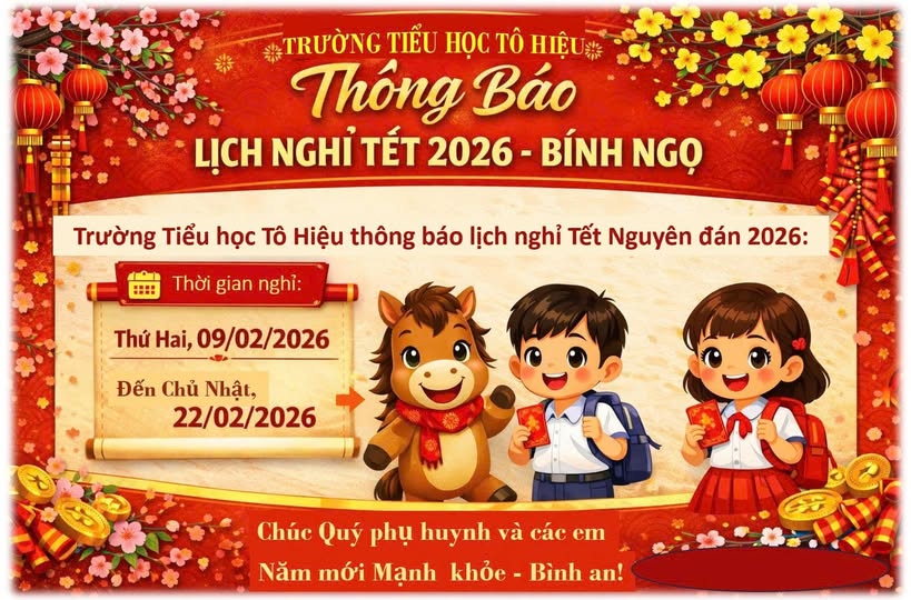 TRƯỜNG TIỂU HỌC TÔ HIỆU THÔNG BÁO LỊCH NGHỈ TẾT NĂM 2026 – BÍNH NGỌ
